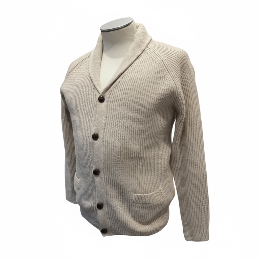 Il collo a scialle valorizza la linea del viso e dona un tocco sofisticato, mentre la lavorazione in lana merino extrafine e cashmere garantisce morbidezza, calore e leggerezza.