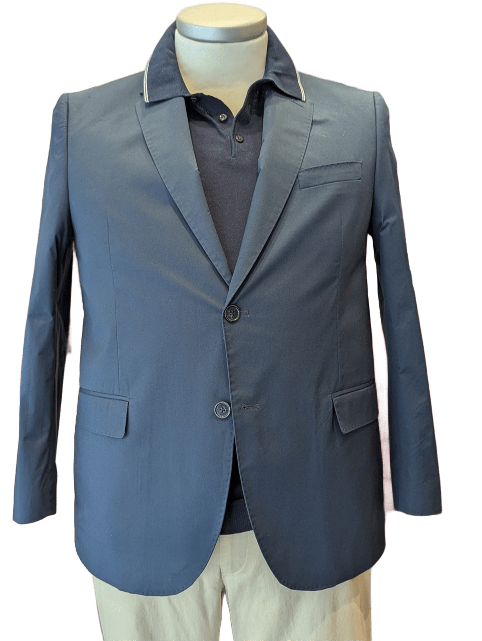 Questa giacca blu in cotone elasticizzato unisce eleganza e comfort in un capo leggero, sfoderato e perfetto per la stagione calda.